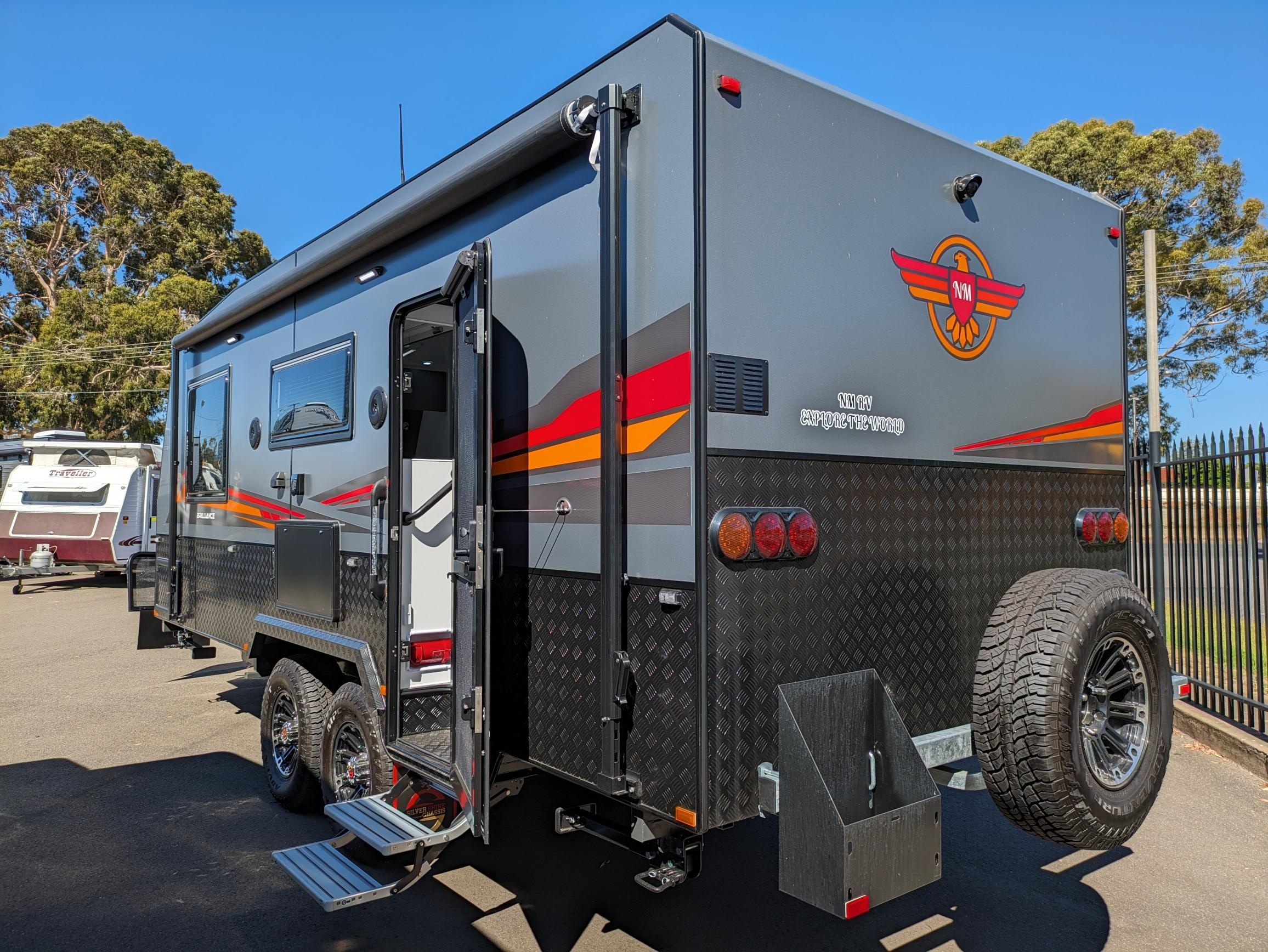 This NM Off Road Caravan is certainly the BRILLIANCE. Featuring Independent Suspension, 6 inch A-Frame and Chassis and chassis raiser, Extended A-Frame with Tool box with sliders inside, Stone Guard, DO35 Coupling, Checker Plate Sides, Tunnel boot storage,Roll out awning Jerry can holder and rear view camera just to name a few features on the outside.