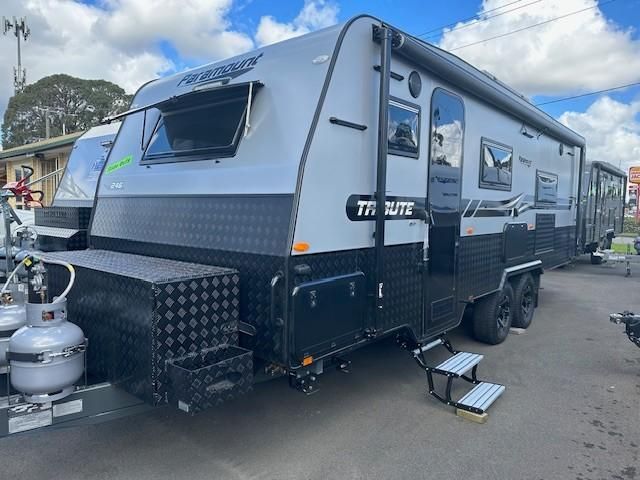 This caravan has been designed and built with all the luxuries you could have dreamt of. Internally you step into the front of the caravan and are greeted with a Grande club lounge at the front with the ability to turn this into an additional sleeping space for any unexpected guests or grandchildren who cannot resist a holiday with the grandparents. This club lounge is wrapped with overhead cupboard storage and two sirocco fans from the ceiling. Stepping further into the caravan you have a galley kitchen with a huge 274L fridge, oven, range hood, microwave, and an angle kitchen with a kitchen sink. A recessed TV is positioned in the kitchen for viewing from the lounge area. The kitchen has a roof-mounted reverse-cycle air conditioner for all-year-round climate comfort. As you walk through the bedroom there is an island lift-up queen bed that slides out the off side of the caravan with a large 40″ TV at the foot of the bed. The whole bedroom has 4 robes and ample overhead cupboards for all your storage needs. The bedroom has two Sirocco fans to provide you with all-night sleeping comfort in warmer climates. Following through to the rear of the caravan is a large ensuite with a front load 4kg washing machine. The caravan is run-off twin 200amp Lithium battery system with 2x200watt solar panels and an inverter system so it reaches off-grid capabilities and takes you beyond your dreams.