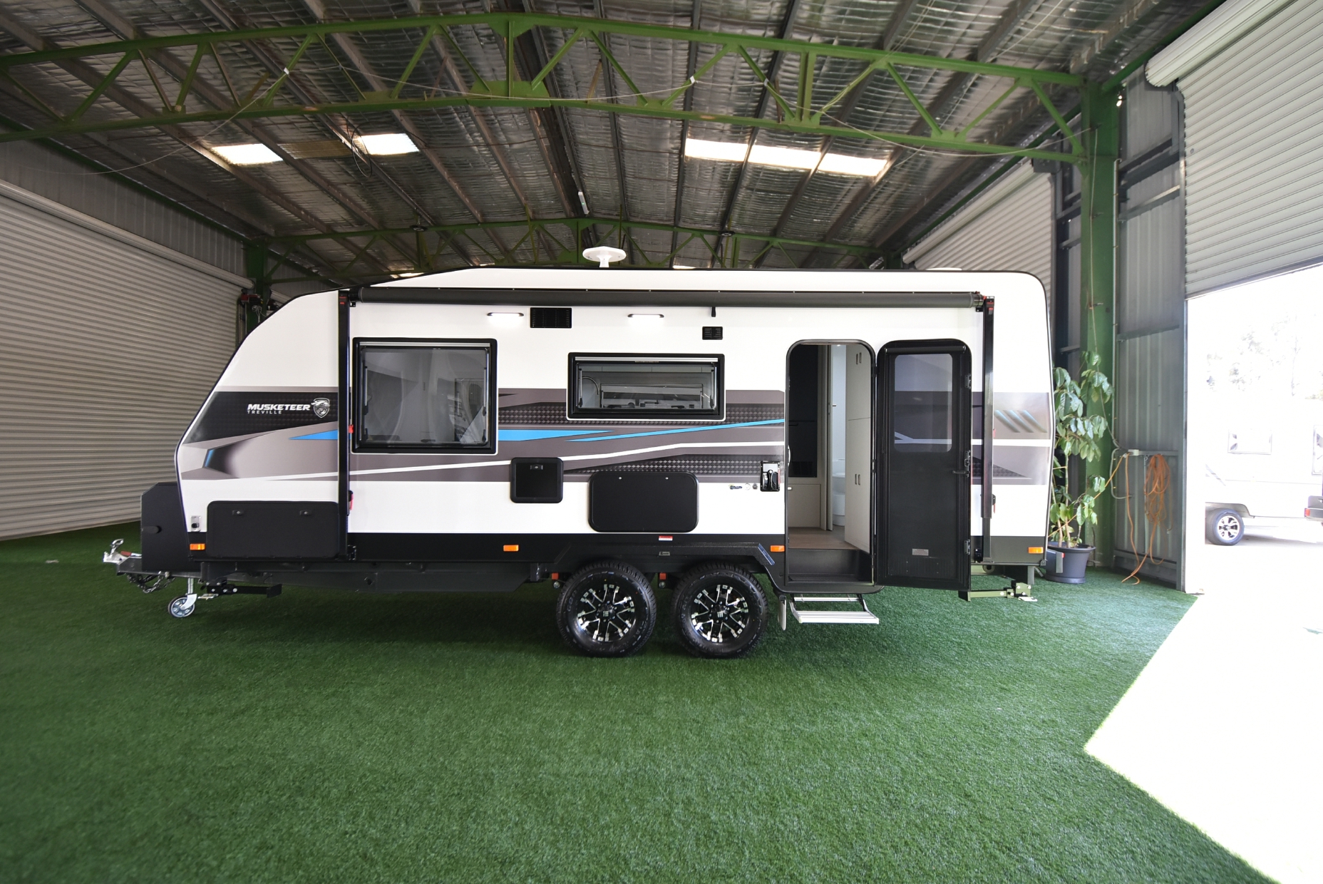 The STANDOUT 2025 Spec Lifechanger Pathway caravan offers modern interior design and finishes, with hidden ambient lighting, smooth cabinet fascias, and various exclusive features. It has external features such as a 110a Agm Battery, 12 Pin Flat Plug, 2 x Anderson Plug, and a 200w Solar Panel. The caravan also includes special features like a Square Edge Benchtop, Full Composite Build, Internal Grab Handle, and Remote Control Lighting. Internally, it has a Cafe Seating area, Queen Island Bed, 24″ Smart TV, Gas/Elec Hotwater, and a Full Ensuite. Other features include a 170L Fridge/Freezer, Reverse cycle A/C, and a Top Load Washing Machine.